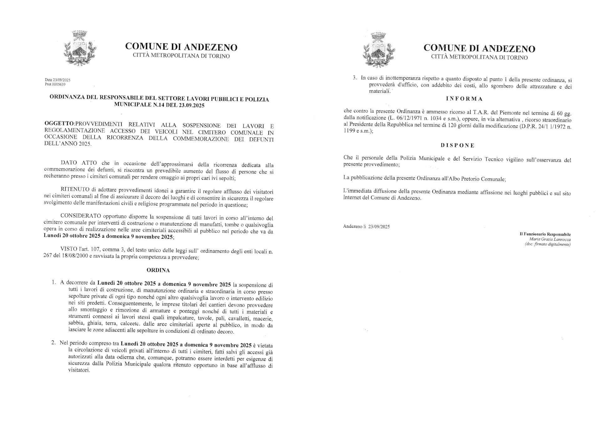Provvedimenti per la sospensione lavori e regolamentazione accesso nel cimitero comunale in occasione della ricorrenza della commemorazione dei defunti dell'anno 2025